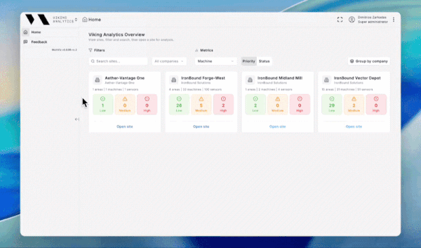 A new unified page now displays the health status of all sites. Sites are organized by company, providing a clear overview and allowing you to quickly open any specific site for deeper analysis.